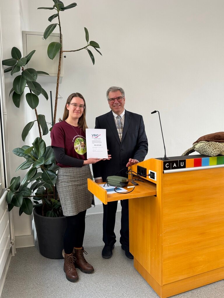 Bei der feierlichen Siegerehrung am Freitag richtete zunächst Prof. Elmar Wolf vom Biochemischen Institut der CAU – selbst einst IBO-Teilnehmer – den Blick in die Karrieremöglichkeiten in den Biowissenschaften. In seinem Fachvortrag stellte er außerdem seine Forschung zu PROTACs vor: therapeutische Moleküle, die zelleigene Komponenten des Proteinabbaus gezielt zu Proteinen in Krebszellen lenken können. Die anschließende Diskussion zeigte eindrucksvoll, auf welch hohem Niveau sich viele der Teilnehmenden bereits mit aktueller Forschung auseinandersetzen.